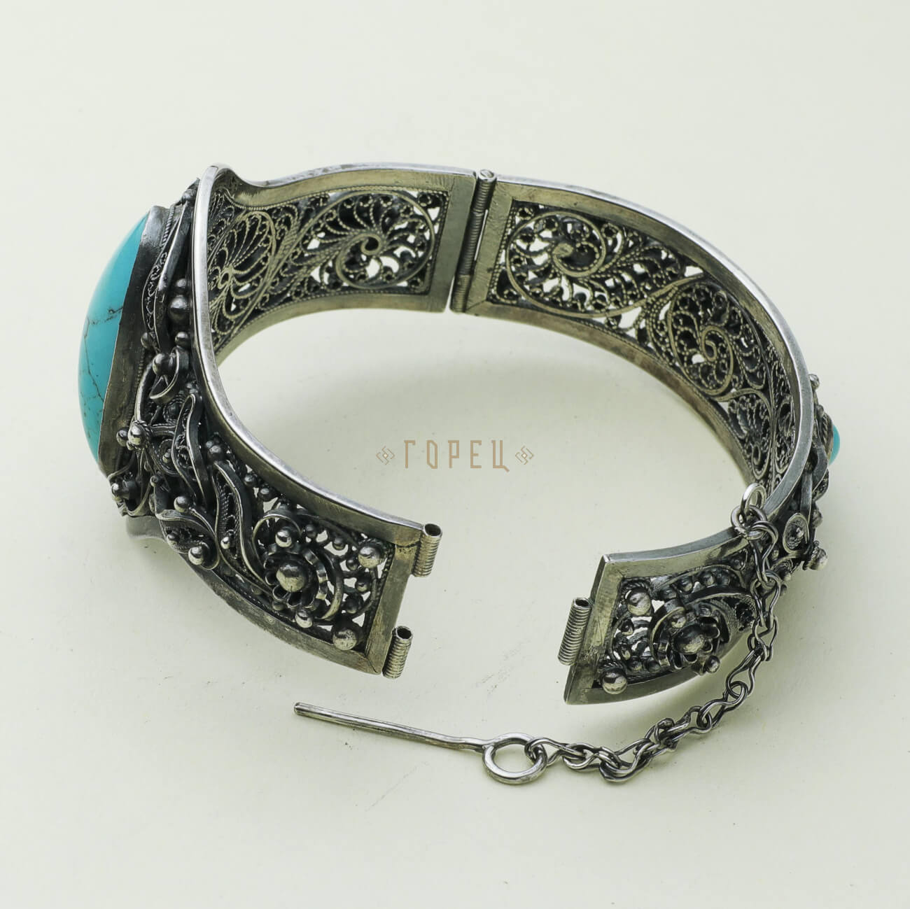 Женский браслет ручной работы от мастера села Кубачи. Выполнен из серебра, украшен натуральной бирюзой.